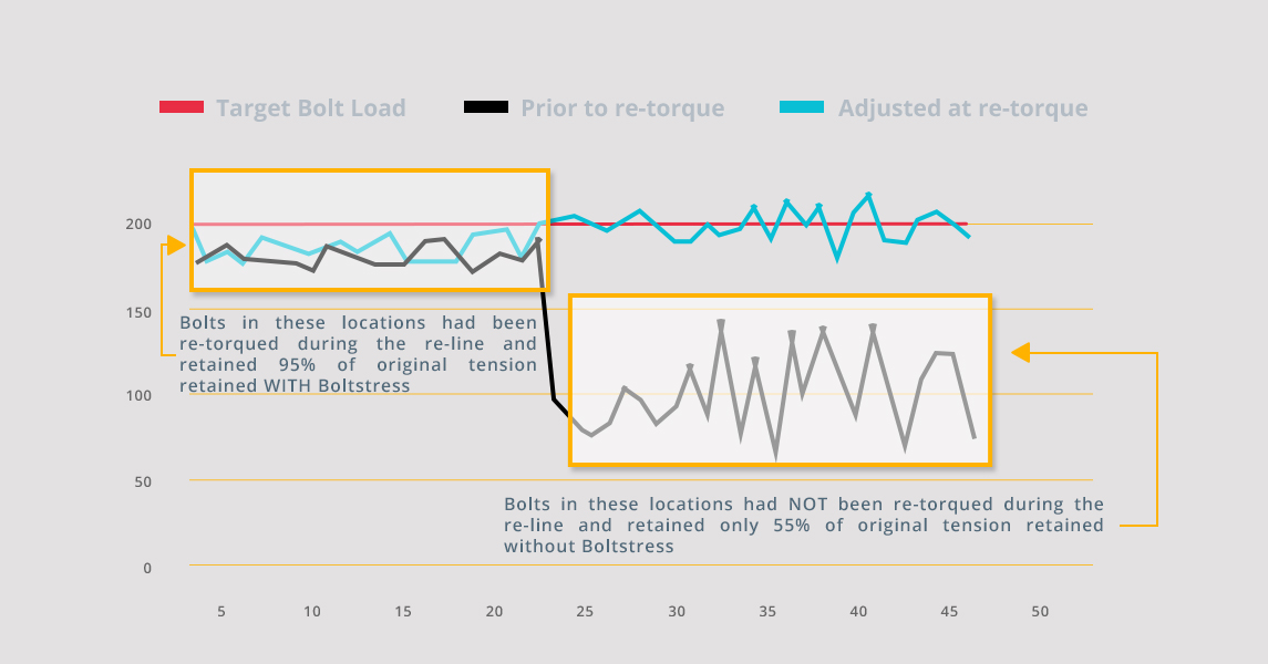 When we begin a re-line process, we make sure all bolts are tight enough for daily operation. We check the bolts during a re-torque as well and adjust those bolts that need it. This process alone cuts down the work by half. An adjusted bolt typically retains 95% of its original tension, while those that have not been re-torqued operate at only 55% of the original tension.